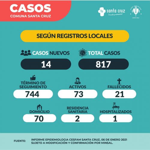 Vecinos y vecinas de Santa Cruz, informamos que fueron confirmados 14 nuevos casos de COVID-19 en nuestra comuna y 3 pacientes recibieron su alta médica, lo que genera 73 habitantes activos al virus (70 en cuarentena domiciliaria, 2 en ... Read More »