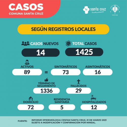 Durante esta jornada se han confirmado 14 nuevos casos de COVID-19, 17 han recibido su alta médica y 89 personas se encuentran activas al virus en la comuna de Santa Cruz, según registros locales. En relación a lo anterior, 1336 ... Read More »